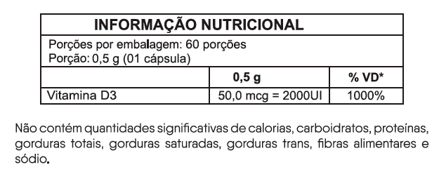 Ingredientes: Colecalciferol (Vit. D3), celulose microcristalina, estearato de magnésio e dióxido de silício. Composição da cápsula: gelatina, dióxido de titânio, corantes tartrazina e azul brilhante. NÃO CONTÉM GLÚTEN.